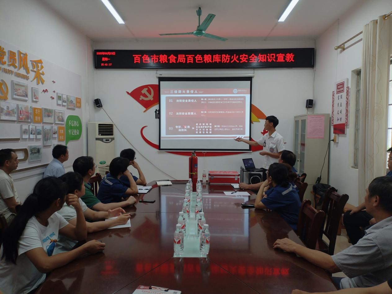 为提高百色市粮食局百色粮库全体人员的消防安全意识,确保全员熟悉如何在发生火灾时自救和互救常识,保障全员的生命和财产安全;按照《新安全生产法》相关规定,积极落实“管业务必须管安全、管行业必须管安全、管生产经营必须管安全”的要求,明确落实“三级责任人”责任制度;积极做到《消防安全治本攻坚三年行动》方案,在2025年6月23日开展2025年上半年消防安全防火学习及灭火演练。 一、主讲单位: 广西百色防控火中心(联系电话:0776-2107119) 二、学习内容: 1.各级岗位职责、法律法规安全知识 2.“四个能力”“四懂四会”的基本内容 3.用火、用电、用气、用油的火灾隐患防范和扑灭方法 4.单位火灾、家庭火灾、车辆火灾隐患防范和扑灭方法 5.科学逃生自救的方法 6.正确辨别灭火器的真伪方法 7.消防器材的认识和使用 8.灭火器的正确使用及实际操作方法 三、 参加人员 百色市粮食局百色粮库 四、学习现场